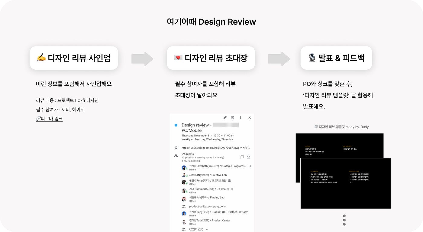 여기어때는 재택근무를 지속하면서도 온라인 협업 문화를 강화하고 있어요. UX팀의 'Design Review'와 'Design Quick Review' 문화는 이를 잘 보여줍니다. 피그마를 활용한 실무자 간 피드백을 통해 온라인으로도 효과적인 협업이 가능하도록 하고 있죠. 이러한 리뷰 문화는 다양한 직군이 참여하여 프로젝트의 배경과 문제점, 목표 등을 공유하는 기회를 제공합니다.